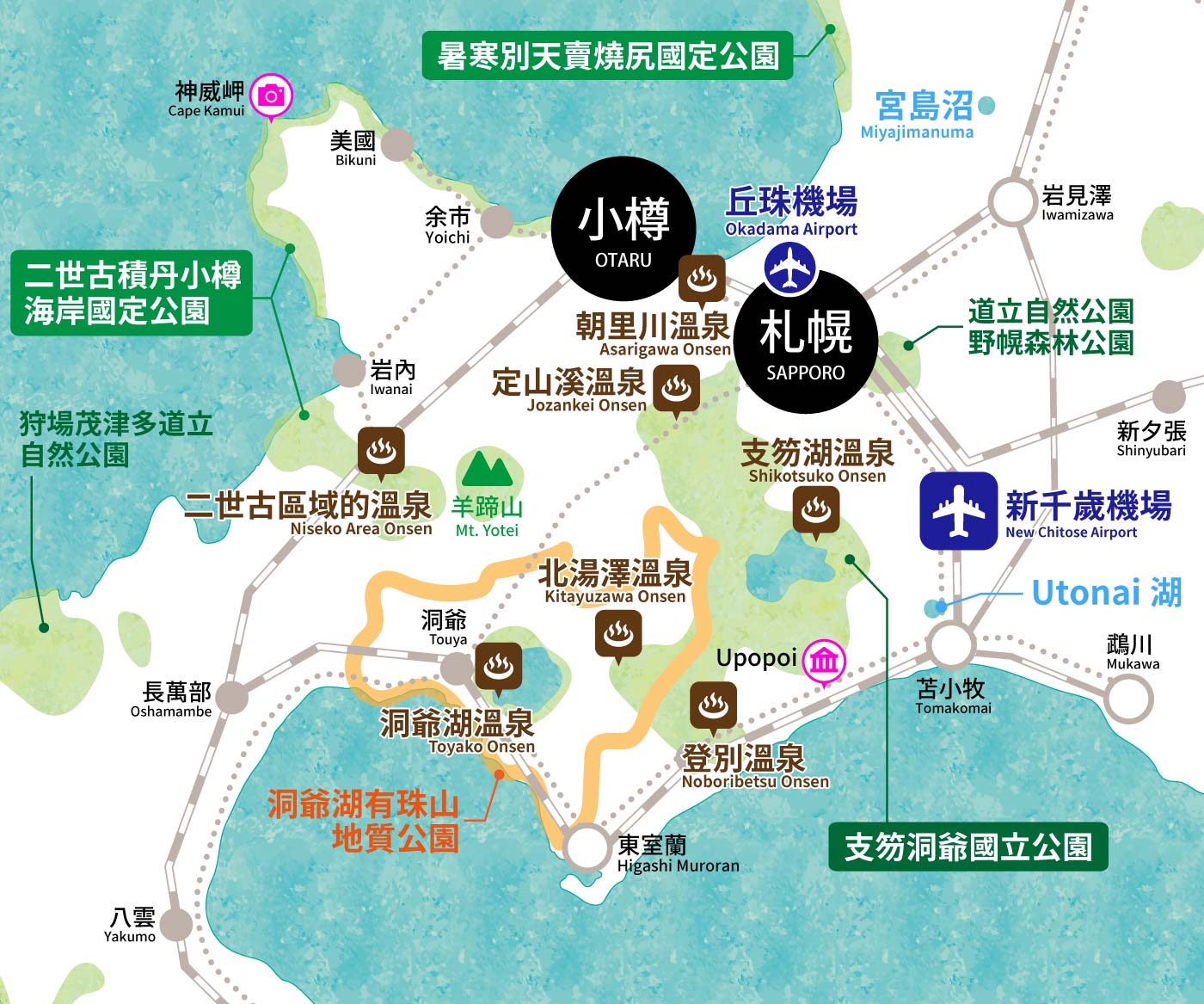 札幌市、小樽市、千歲市、北廣島市、二世古地區、苫小牧市、白老町、登別市、洞爺湖町