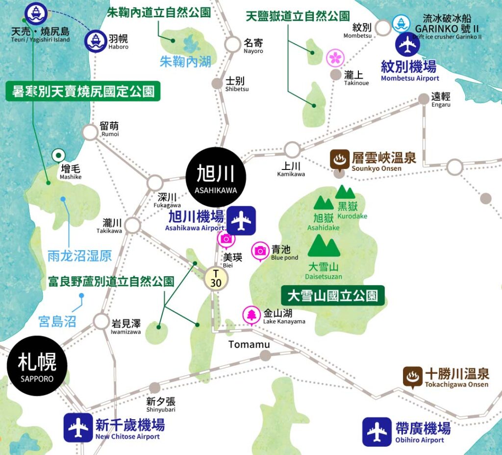 旭川站、旭川機場、旭山動物園、上野農場、就實之丘、神居古潭、上川神社、旭山公園、三六街、旭川拉麵村