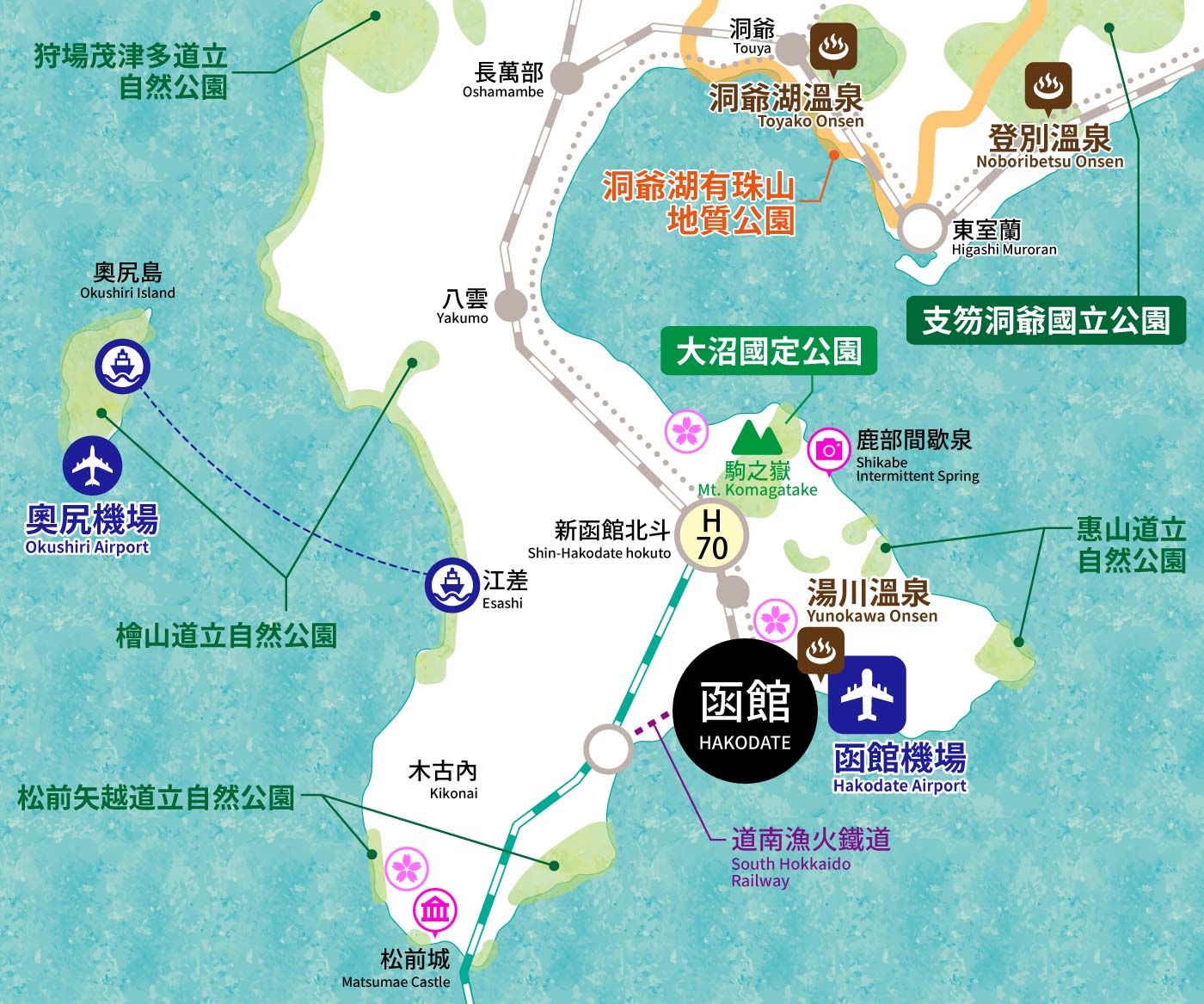 | 函館市 | 函館機場、函館站、客輪碼頭、函館朝市、函館山、五棱郭公園、箱館奉行所、五棱郭塔、函館八幡宮、金森紅磚倉庫郡、世界文化遺產繩文文化、大船遺跡、垣之島遺跡、函館公園、湯之川溫泉、函館哈裏士斯正教會、舊函館區公會堂、特拉皮斯蒂娜修道院、函館大門橫丁、立松岬、八幡阪、香雪園 |