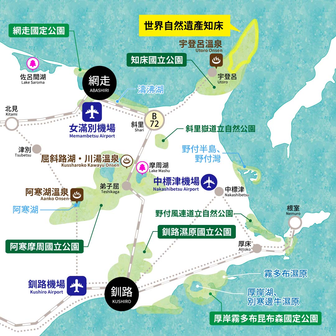| 阿寒湖區域 | 阿寒國立公園、阿寒湖溫泉、阿寒湖、 Ikoro、 阿寒湖阿依努古丹、雄阿寒嶽、雌阿寒嶽、阿寒湖訪問者中心、Churui島、道之站阿寒丹頂之裏 |