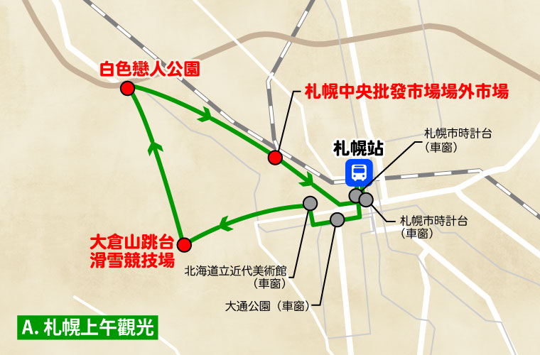 | 10:50~11:50 | ※②白色戀人公園(參觀製造生產線・購物) 【60分鐘】 |