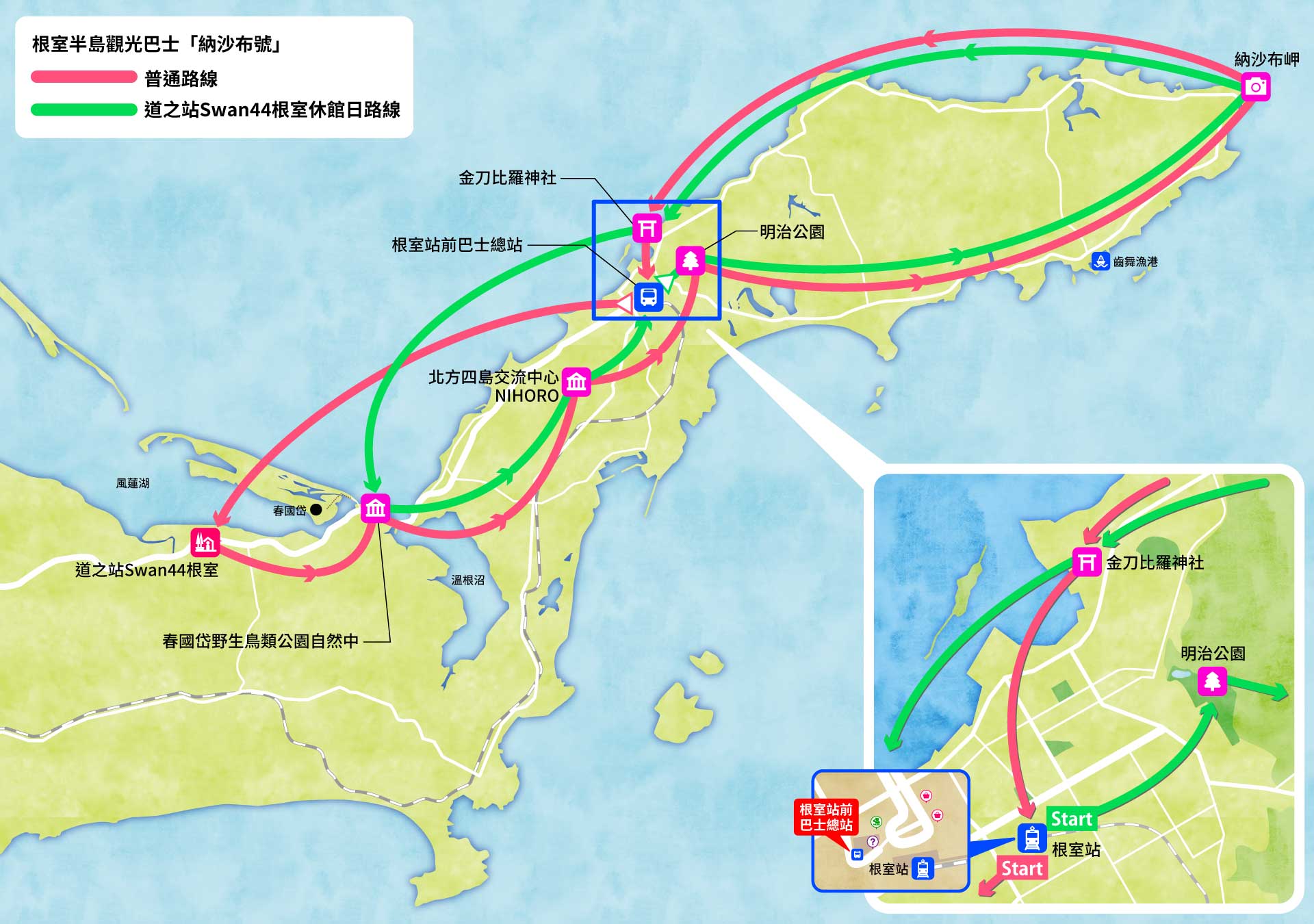 • 明治公園:請從根室站前巴士總站乘坐納沙佈線或公住循環線,在「明治町1丁目」或「曙町」下車。